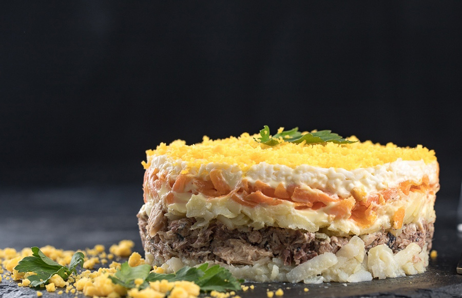 Выкладывайте в салатницу слоями, тщательно перемазывая майонезом или сметаной: половину картофеля, лук, затем консервы, вторую часть картофеля, морковь и белок. Самый верхний слой — желток. Отправьте салат минимум на 2 часа в холодильник, прежде чем подавать на стол.